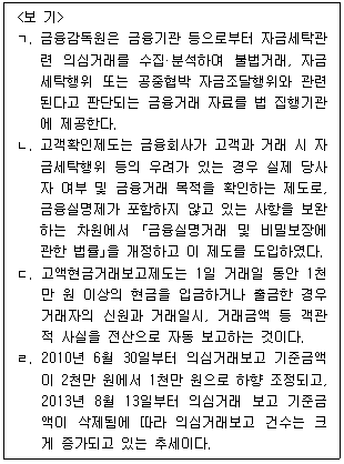 <보기>에서 자금세탁방지제도에 대한 설명으로 옳은 것을 모두 고른 것은?