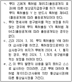 甲은 2023. 6. 1. 미국에 발명 A에 대하여 특허출원 X를 하였고, 이후 2023. 12. 1. 국내에 특허출원 X를 기초로 특허법 제54조(조약에 의한 우선권 주장) 우선권 주장을 수반하면서 명세서에 발명의 설명에만 A, B를 기재하고 청구범위를 적지 않은 특허출원 Y를 하였다. 한편 乙은 2023. 9. 1.부터 발명 A를 국내에서 실시하고 있는 자이다. 다음 중 옳지 않은 것을 모두 고른 것은? (각 설명은 독립적임)