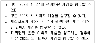 특허권 A에 대한 특허무효심판에 대한 심결이 2023. 1. 27. 오전 0시 확정(해당 심결 이전의 확정심결과 저촉되지 않음)되었고, 특허권자 甲은 2023. 2. 6. 재심사유를 알게 되었으며, 심결등본의 송달에 의하여 특허무효심결이 있는 것을 알게된 날은 2023. 2. 13.이다. 甲은 확정된 무효심결에 대해서 재심을 청구하려 한다. 이에 관한 설명으로 옳은 것을 모두 고른 것은? (모든 일자는 공휴일이 아닌 것으로 하며, 아래 각 지문은 독립적으로 판단할 것)