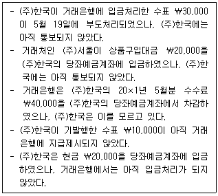 20×1년 5월 말 (주)한국의 수정 전 당좌예금 장부잔액과 거래은행 측 수정 전 당좌예금잔액이 일치하지 않는 원인은 다음과 같다. (주)한국의 수정 전 당좌예금 장부잔액이 ₩160,000일 때, 거래은행 측 수정 전 당좌예금잔액은?