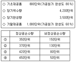 평균법을 이용한 종합원가계산을 적용하는 (주)한국은 공손품의 검사를 공정의 50% 시점에서 수행하며, 검사시점을 통과한 수량의 10%를 정상공손으로 허용하고 있다. (주)한국의 생산 관련 자료가 다음과 같을 때, 정상공손수량과 비정상공손수량을 바르게 연결한 것은? (단, 가공원가는 공정 전반에 걸쳐 균등하게 발생한다)