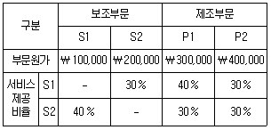 (주)한국은 보조부문(S1, S2)과 제조부문(P1, P2)을 가지고 있고, 보조부문 원가들을 제조부문으로 배부한다. 다음 자료에 의하여 보조부문원가를 단계배부법으로 배부할 경우, 배부 후 제조부문 P1의 원가합계는? (단, S1을 먼저 배부한다)