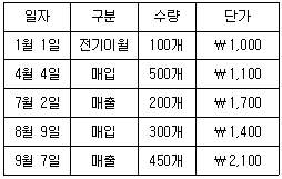 다음은 (주)한국의 재고자산 관련 자료이다. 선입선출법을 적용할 경우, (주)한국이 재무상태표에 인식할 기말 재고액은? (단, 재고자산 감모 및 평가손실은 발생하지 않았으며, 재고자산은 계속기록법에 의한다)