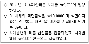 다음 자료를 이용한 (주)한국이 사채발행 시 인식할 사채할인발행차금은?