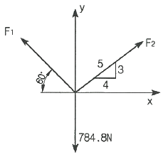 그림에서 784.8N과 평형을 유지하기 위한 힘 F1과 F2는?