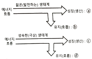 그림과 같이 생태계 발달 모형에 따라 두 가지의 생태계에 대해 성장(생산)과 유지(호흡)는 어떻게 달라지는지 ⓐ~ⓓ를 옳게 설명한 것은?