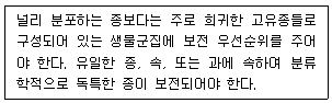 다음은 생물의 종과 군집보호를 위한 우선 순위 선정기준이다. 가장 적합한 선정기준은?
