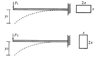 동일재료를 사용한 캔틸레버 보에서 작용하는 집중하중의 크기가 P1 = P2 일 때, 보의 단면이 그림과 같다면 최대처짐 y1 : y2 의 비는?