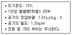 다음과 같은 조건에서 2000명을 수용하는 극장의 실온을 20℃로 유지하기 위한 필요 환기량은?