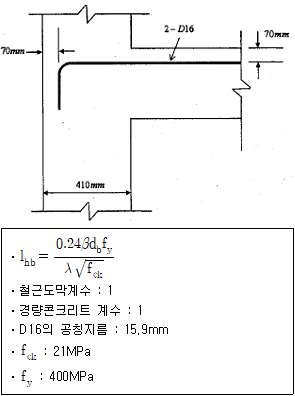 다음 그림과 같이 D16철근이 90°표준갈고리로 정착되었다면 이 갈고리의 소요정착길이(lhb)는 약 얼마인가?