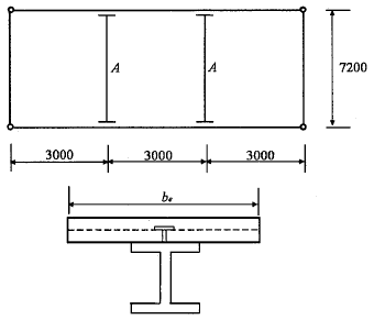 그림과 같은 콘크리트 슬래브에서 합성보 A의 슬래브 유효폭 be를 구하면? (단, 그림의 단위는 mm임)