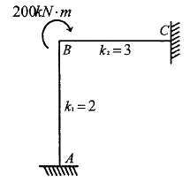절점 B에 외력 M=200kN·m가 작용하고 각 부재의 강비가 그림과 같을 경우 MAB는?
