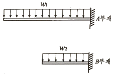 다음 두 보의 최대 처짐량이 같기 위한 등분포하중의 비로 옳은 것은? (단, 부재의 재질과 단면은 동일하며 A부재의 길이는 B부재 길이의 2배임)