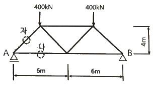 그림과 같은 트러스에서 ‘가’ 및 ‘나’ 부재의 부재력을 옳게 구한 것은? (단, -는 압축력, +는 인장력을 의미한다.)