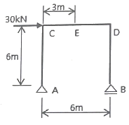 다음 그림과 같이 수평하중 30kN이 작용하는 라멘구조에서 E점에서의 휨모멘트 값(절대값)은?