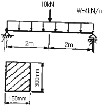 그림과 같은 하중을 받는 단순보에서 단면에 생기는 최대 휨응력도는? (단, 목재는 결함이 없는 균질한 단면이다.)
