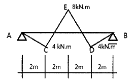 다음 그림은 각 구간에서 직선적으로 변하하는 단순보의 모멘트도이다. C점과 D점에 동일한 힘 P1이 작용하고 보의 중앙점 E에 P2가 작용할 때 P1과 P2의 절대값은?