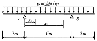 다음 그림과 같은 내민보에서 휨모멘트가 0이 되는 두 개의 반곡점 위치를 구하면? (단, 반곡점 위치는 A점으로부터의 거리임)