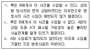 A는 동업자 B의 동업자금 유용에 대하여 손해배상청구소송을 제기하고자 변호사 甲과 상담하였는데, 상담 중 A는 분쟁과 관련하여 B가 알면 패소할 가능성이 높은 불리한 사실관계를 상당 정도 털어놓았다. 변호사 甲은 수임료가 합의되지 않아 수임을 거절하였는데, 그 후 B가 甲을 찾아와 위 동업자금 유용과 관련한 소송사건을 맡아 줄 것을 요청하였다. 甲은 B의 승소 가능성이 높고, 수임료를 제대로 지급할 수 있을 것으로 보고 있다. 다음 설명 중 옳은 것을 모두 고른 것은?