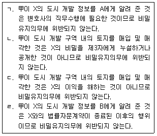 변호사 甲은 건설회사 X와 법률자문계약을 체결한 후 X의 각종 법률문제에 관하여 법률자문을 제공하였는데, 그 과정에서 X의 비밀인 도시 개발 정보를 알게 되었다. 甲은 법률자문 업무를 보조하게 할 목적으로 도시 개발 정보를 사무직원 A에게 알려 주었다. 한편, 법률자문계약이 기간 만료로 종료된 이후 甲은 도시 개발 구역에 포함되어 있는 토지를 매입하였고, 친구 B에게 X의 도시 개발 정보를 알려 주었다. 그 후 甲은 토지를 제3자에게 매각하여 막대한 차익을 얻었다. 이에 관한 설명 중 옳지 않은 것을 모두 고른 것은?