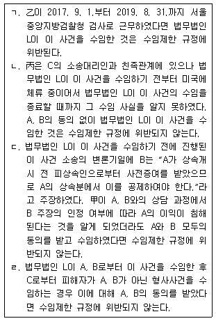 A와 B는 2020. 3. 7. C를 상대로 하여 서울중앙지방법원에 소송계속 중인 상속재산 분할청구사건(이하 ‘이 사건’이라 한다)을 법무법인 L에 의뢰하였다. 법무법인 L의 구성원 변호사로 甲, 乙, 丙이 있고 구성원 아닌 소속 변호사로 丁이 있다. 법무법인 L은 담당변호사로 甲과 丁을 지정하였고, 乙과 丙은 이 사건 수임이나 업무수행에 관여하지 않았다. 이에 관한 설명 중 옳지 않은 것을 모두 고른 것은?
