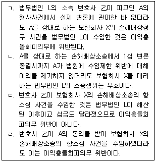법무법인 L은 피고인 A의 보험사기 형사사건을 수임하여 소속 변호사 甲, 乙을 담당변호사로 지정하고 변호사 甲이 A를 변호하였다. 한편 해당 보험사기 피해자인 보험회사 X는 A를 상대로 하는 손해배상청구 사건을 법무법인 L에 위임하여 소속 변호사 乙이 그 1심 사건을 수행하였다. 이후 법무법인 L이 해산되자 변호사 乙은 개인법률사무소를 개업하고 보험회사 X의 위 손해배상소송의 항소심 사건을 수임하여 수행하였다. 이 경우 변호사의 이익충돌회피의무에 관한 설명 중 옳은 것을 모두 고른 것은? (다툼이 있는 경우 판례에 의함)