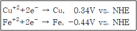 금속 구리(Cu)와 철(Fe)이 수용액 내에서는 서로 분리되어 있으나 외부회로를 통하여 연결되어 있다. 이때 예측되는 거동에 대한 설명으로 가장 옳은 것은? (단, 수용액의 Cu+2, Fe+2의 농도는 1M이며, 표준전극전위는 <보기>와 같다.)