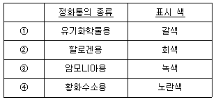 방독마스크 정화통의 종류와 외부 측면의 표시 색의 연결이 옳지 않은 것은? (순서대로 ①, ②, ③, ④)