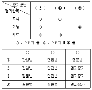 다음은 안전교육의 평가항목별 효과적인 평가방법을 정리한 것이다. ( ) 안에 들어갈 말로 옳은 것은? (순서대로 ①, ②, ③, ④)