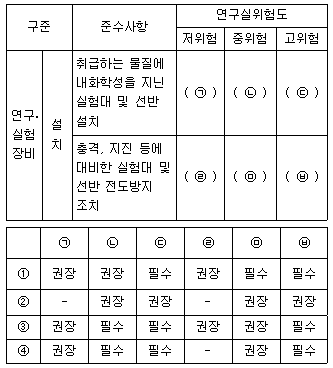 다음은 「연구실 설치운영에 관한 기준」 중 연구‧실험 장비의 설치에 관한 내용의 일부이다. ( ) 안에 들어갈 말로 옳은 것은? (순서대로 ①, ②, ③, ④)