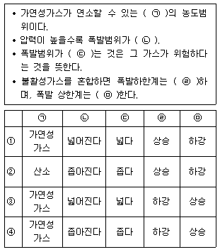 <보기>는 가스 폭발범위에 관한 설명이다. ( )안에 들어 갈 말로 옳은 것은? (순서대로 ①, ②, ③, ④)