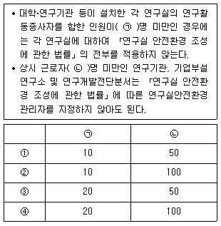 다음은 「연구실 안전환경 조성에 관한 법률 시행령」에서 규정하는 적용범위에 관한 설명이다. ( )안에 들어갈 말로 옳은 것은? (순서대로 ①, ②, ③, ④)