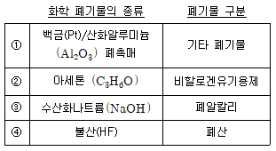 화학 폐기물의 종류와 폐기물의 구분의 연결이 옳지 않은 것은? (순서대로 ①, ②, ③, ④)