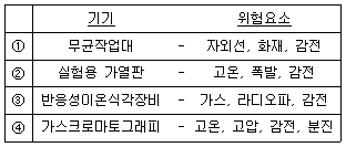 연구실 주요기기와 해당 주요 위험요소의 연결이 옳지 않은 것은?