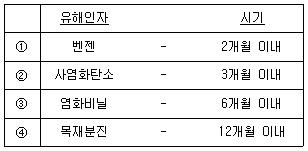 「연구실 안전환경 조성에 관한 법령」에서 규정하는 특수건강검진 대상 유해인자를 취급하는 연구활동종사자는 특수건강검진을 받야야 한다. 연구활동종사자가 유해인자를 취급한 후 특수 건강검진을 받아야 하는 유해인자와 첫 번째 특수건강검진 시기의 연결이 옳지 않은 것은?