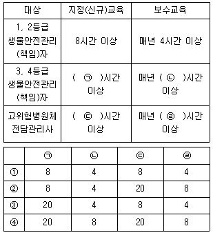 다음은 「연구실안전 및 생물안전 관리 등에 관한 규정」에 따른 대상별 생물안전 관련 법정교육 시간에 관한 내용이다. ( ) 안에 들어갈 숫자로 옳은 것은?