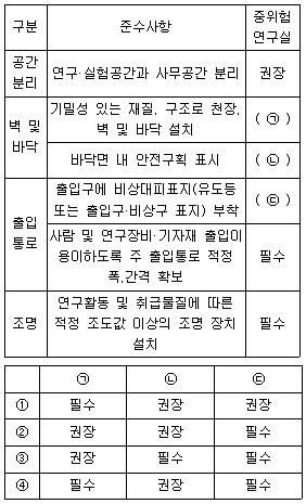 다음은 「연구실 설치운영에 관한 기준」에서 규정하는 중위험연구실의 설치 준수사항 중 일부이다. ( ) 안에 들어갈 말로 옳은 것은?
