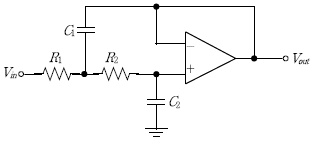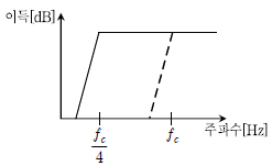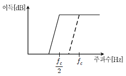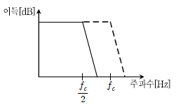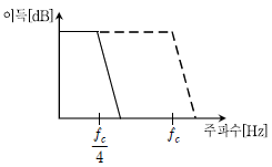 다음 차단주파수가 fc인 2극 능동 필터 회로에서 R1과 R2를 각각 2배씩 증가시켰을 때, 주파수 응답특성의 변화로 옳은 것은? (단, 점선은 다음 회로의 주파수 응답특성이고 실선은 R1과 R2를 각각 2배씩 증가시켰을 때의 주파수 응답특성이다. 연산증폭기는 이상적이라고 가정한다)