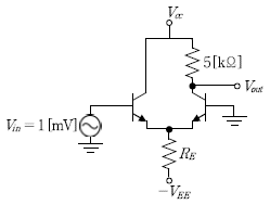 다음 차동증폭기 회로에서 입력 임피던스 Zin[kΩ]과 출력전압 Vout[mV]는? (단, BJT는 서로 동일하고, BJT의 전류 이득 βac=100와 교류 이미터 저항 r'e=25 [Ω]이다. RE ≫r'e이고 BJT가 활성영역에서 동작한다고 가정한다) (순서대로 Zin, Vout)