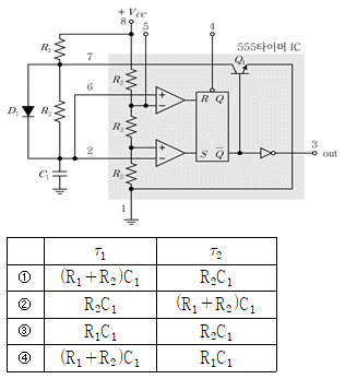 다음 555타이머 IC를 활용한 구형파 발생 회로가 정상동작할 때, 커패시터 C1의 충전속도를 결정하는 시정수 τ1과 방전속도를 결정하는 시정수 τ2는? (단, 모든 소자는 이상적이다)