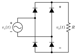 다음 전파정류회로에 대한 설명으로 옳은 것은? (단, 입력전압은 vs(t)=Vmsin(120πt)[V]이고, 다이오드는 이상적이다)