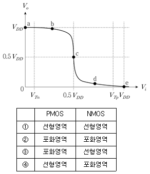 상보형 CMOS 인버터의 직류 전달 특성 곡선이 다음과 같을 때, c점에서 PMOS 트랜지스터와 NMOS 트랜지스터의 동작 모드를 바르게 연결한 것은? (단, VTn과 VTp는 각각 NMOS 트랜지스터와 PMOS 트랜지스터의 문턱전압이다)