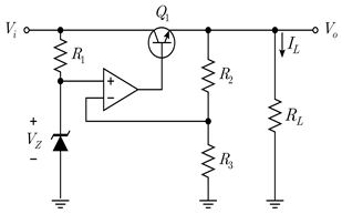 다음 직렬 전압조정기(series voltage regulator)의 부하 전류 IL이 200[mA]일 때, Q1에서 소모되는 전력[W]은? (단, Vi=15[V], VZ=4[V], R1=R2=15[kΩ], R3=10[kΩ], R2+R3》RL, Q1의 전압강하는 무시하며 모든 회로 소자는 이상적이다)