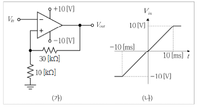 다음 그림 (가)의 회로에 그림 (나)의 신호가 인가될 때, 출력 Vout은? (단, 연산증폭기는 이상적이며 초기 Vout =10 [V]이다)