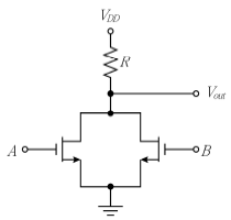 다음 디지털 논리게이트에 대한 설명으로 옳은 것은? (단, VDD= +5 [V]이고, 입력과 출력은 논리적 ‘1’일 때 V=+5 [V], ‘0’일 때 V=0 [V]이다)