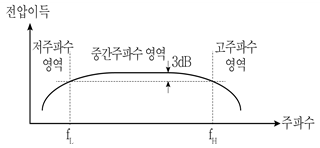 그림은 증폭기 회로에서 입력전압의 주파수와 전압이득 사이의 관계를 나타낸다. 이에 대한 설명으로 옳지 않은 것은?