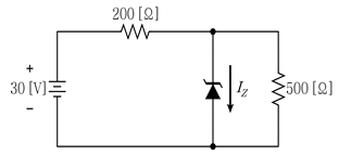 다음 회로에서 제너다이오드에 흐르는 전류 IZ[mA]는? (단, 제너전압은 20[V]이다)