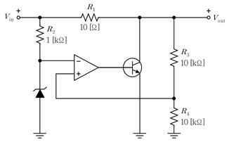 다음 선형 병렬 전압 조정기(shunt regulator)의 R1에서 소모되는 최대 전력[W]은? (단, 입력의 범위는 0≤Vin≤10[V]이며, 모든 회로 소자는 이상적이다)