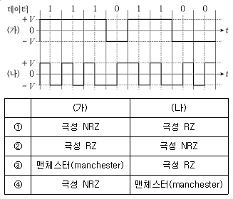 다음 (가)와 (나) 파형은 2진 디지털 데이터를 전송하기 위한 두 개의 라인코드 펄스파형이다. (가)와 (나)에 해당하는 라인코드 방식으로 옳게 짝지은 것은?