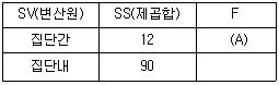 5가지 상담기법의 효과 차이를 검증하기 위하여 각 집단에 10명씩 총 50명을 무선배치하였다. 분석결과가 다음과 같을 때 (A)에 해당하는 값은?